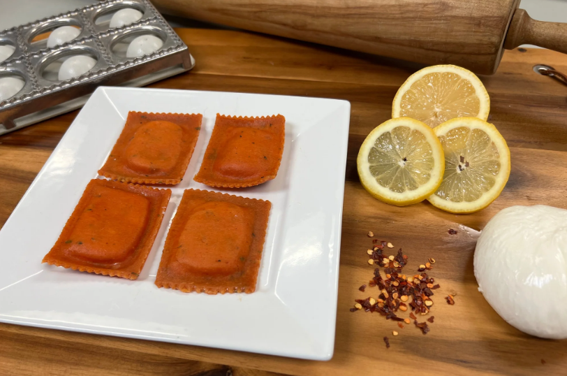This ravioli features creamy, buttery burrata cheese folded with fresh lemon zest, hand-chopped arugula, and a pinch of crushed red pepper flakes for a bit of heat, enveloped in tomato basil dough.