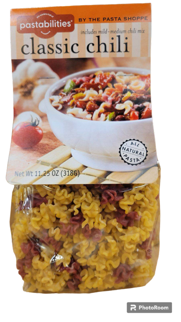 People come back year after year to stock up on our classic chili - a taste like no other! Simple ingredients are combined with our mix, and chili is served in 25 minutes. Wow, your crowd this weekend! Lots of recipe variations on the label - makes a great veggie chili, too! The spice level is mild-medium and serves 6-8. An 11.25 oz bag of pasta with chili mix included! The Pasta Shoppe has been creating fun pasta and Italian food for decades! Don’t miss our soup, pasta sauce, mac and cheese or other unique goodies – are you ready, spaghetti?