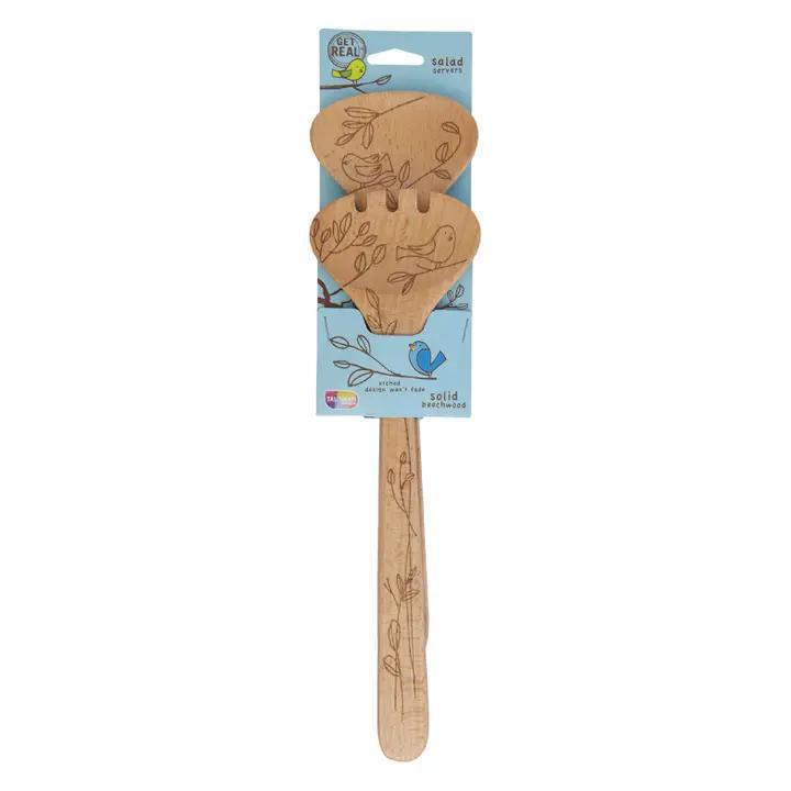 This 12-inch salad spoon and fork set combines beauty and function with a timeless nature-inspired design. Crafted from all-natural beechwood, the laser-etched pattern won't fade, ensuring lasting charm. Designed for comfort, these utensils are gentle on non-stick cookware and won't absorb odors or colors. With a durable natural oil finish, they make a stylish and long-lasting addition to any kitchen. Handwash recommended.