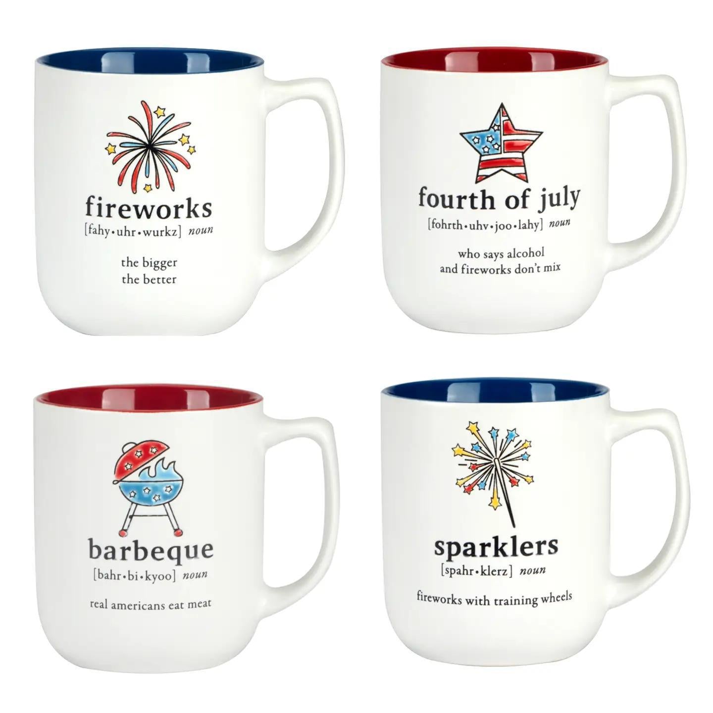 Celebrate your patriotism with every sip from these Stoneware Patriotic Words Mugs, each boasting a generous 18-ounce capacity, perfect for your morning coffee or evening tea. This assorted set features charming, whimsical designs with a touch of humor, capturing the spirit of American holidays with phrases like "the bigger the better" for fireworks, and a playful nod to barbecues as a true American pastime. The vibrant interior colors add a splash of contrast to the crisp white exterior, making these mugs a standout addition to any table. Designed to mix and match with a variety of dinnerware and serveware in this collection, you can coordinate these mugs to create a festive and cohesive look for any patriotic celebration or daily enjoyment. Not only do these mugs offer a daily dose of American pride, but they also make great gifts, whether for a friend overseas, a family member who's a veteran, or a neighbor who loves to host Fourth of July parties