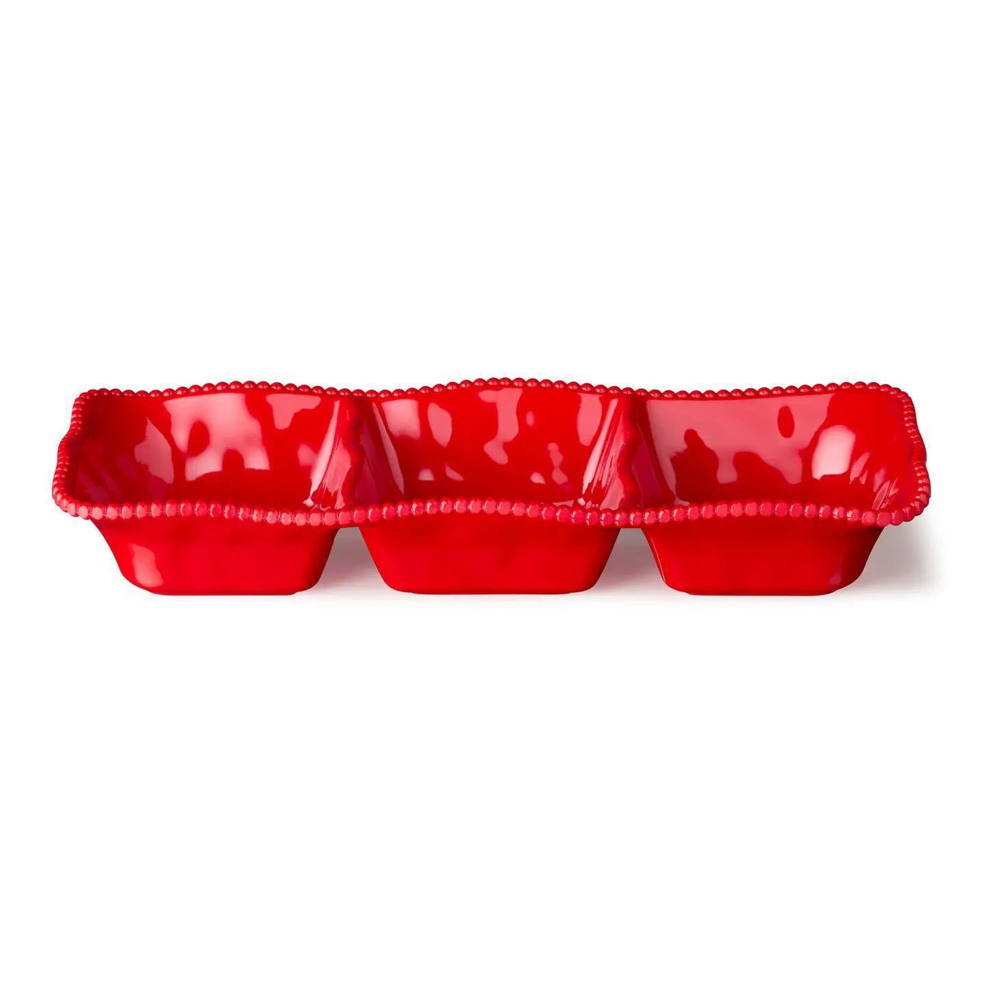Transform your serving game with the Perlette Red 3 Section Server, 14.5in x 5.75 in is the ultimate accessory for hosting. This beautifully designed server allows for a neat and stylish presentation of dips, snacks, or condiments, making it a versatile addition to any gathering.