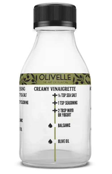 This decorative, glass dressing shaker has recipes that you can easily follow to create delicious, healthy dressings. Simply fill each ingredient starting at the base to the noted lines, shake, and drizzle our of the handy spout onto your salad of choice. We keep a few of these in each of our kitchens, each made up with a different recipe for easy access. Dressing salads has never been easier!