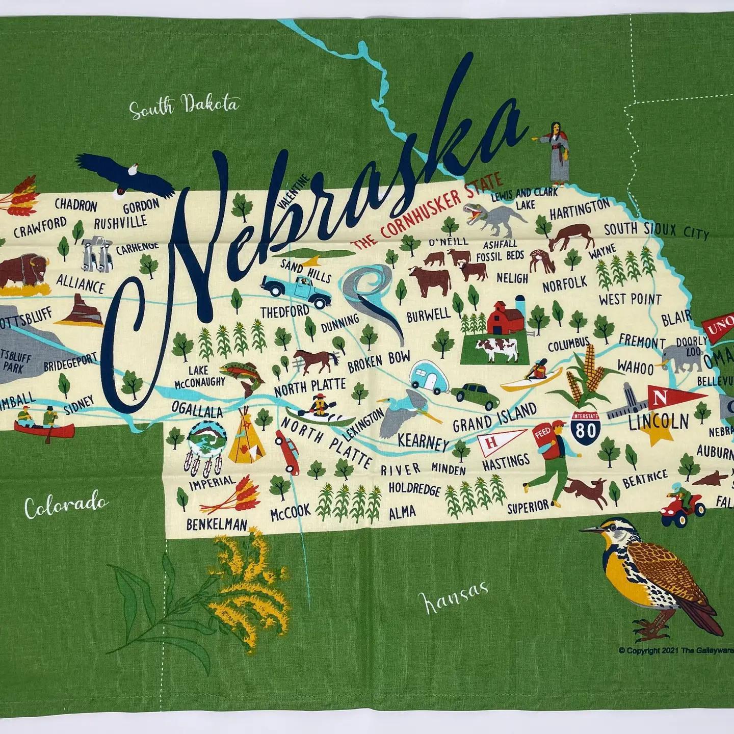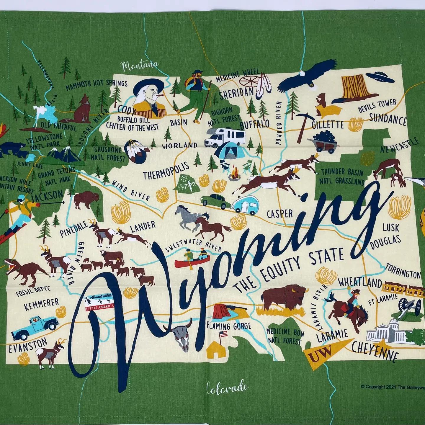 Original Galleyware artwork shows the major towns and attractions. Material: 100% Cotton. Lint-free. Hangs easily with attached loop. Care: Machine wash cold. Tumble dry low or line dry for best results. Safe to iron. Do not use bleach. Do not use fabric softeners which leave an oily, water-resistant layer on the towel, making it harder to absorb moisture.