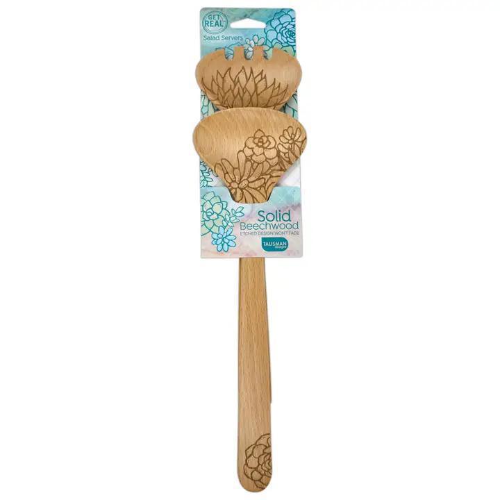 Add a touch of natural elegance to your kitchen with this beautifully designed set of 12-inch salad servers - salad spoon and fork. Featuring a stylish succulent pattern, these solid beechwood utensils are both functional and decorative. The laser-etched design won't fade, ensuring long-lasting beauty. Perfect for serving salads, pasta, and more, they make a wonderful gift for any nature or outdoor lover. Handwash recommended to preserve the wood's quality.