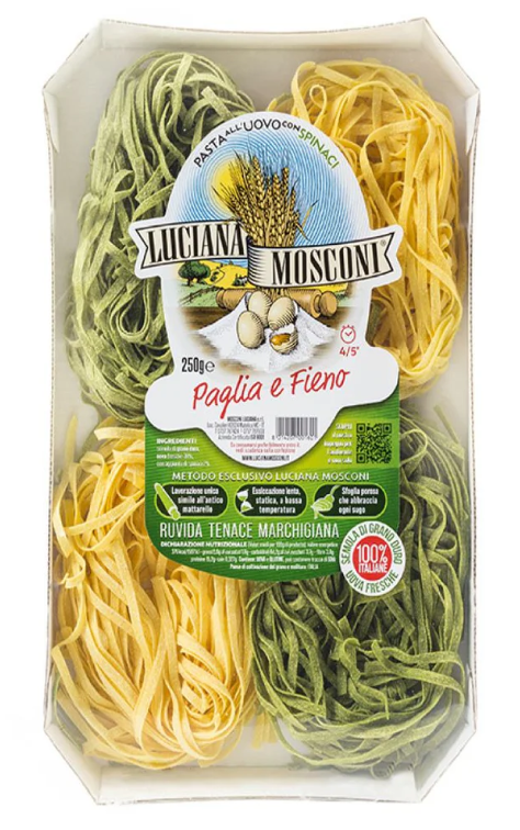 "Paglia e Fieno" ("straw and hay"), nests two types of Tagliatellie - the classic and a spinach-enriched version. Both are perfect with light sauces, with or without tomato.